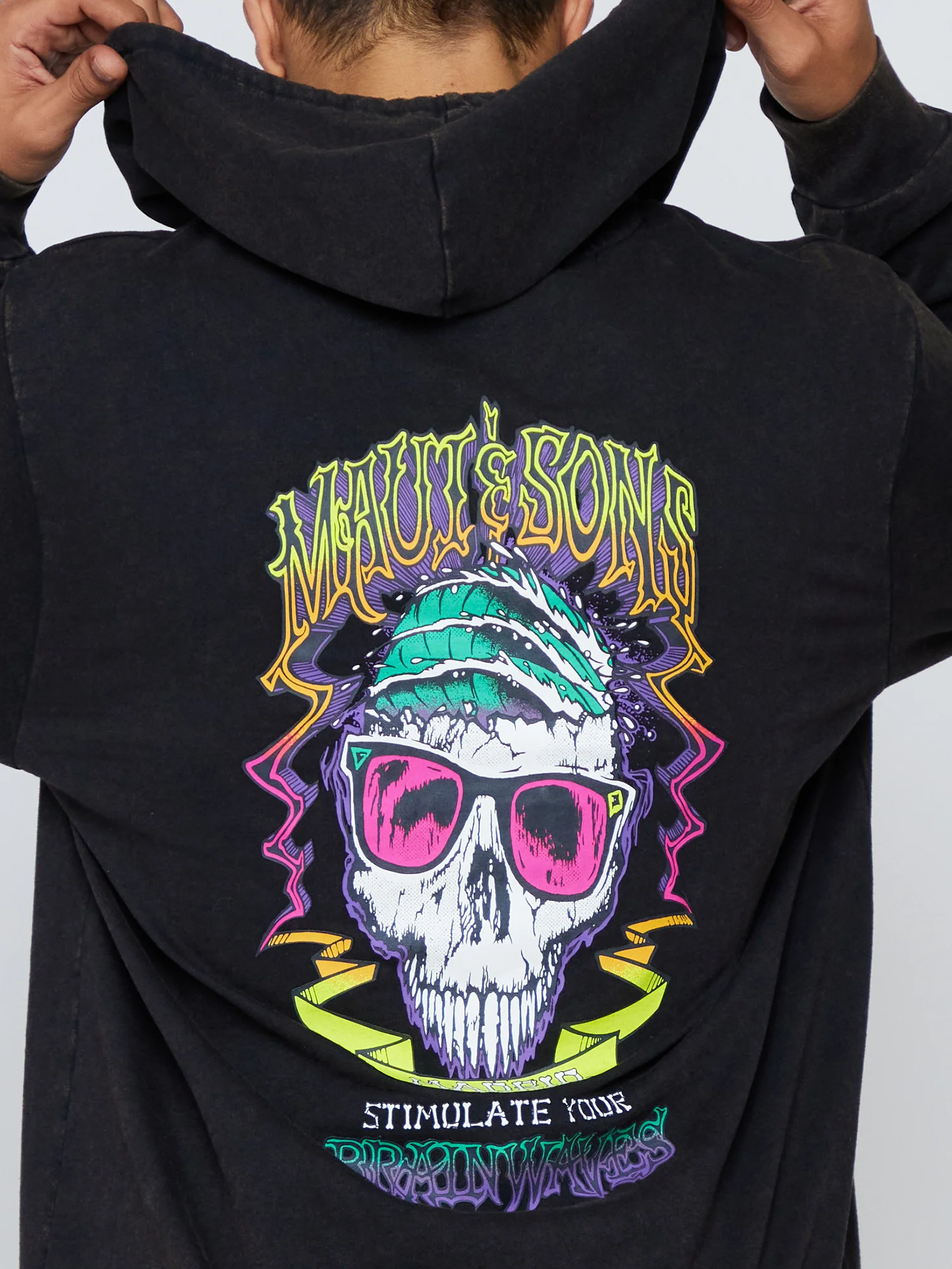 - Hooded sweatshirt with revamped archival Maui and Sons skull graphic graphic on front and back